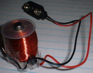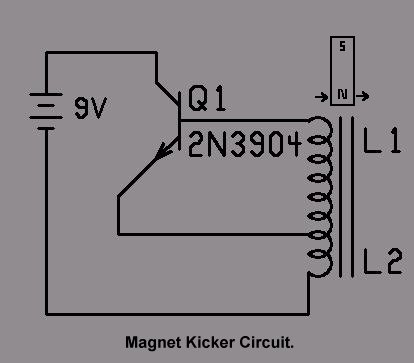 I was able to make my own magnet kicker motor by winding a tapped coil on an iron bolt. For simplicity, I used just one small wire size and wound it as shown (picture to come, check back later). I used some 3.5 mil wire that was handy. The transistor was an NPN 2N3904, but just about any bipolar transistor will work. I have also seen this circuit made with a PNP transistor.