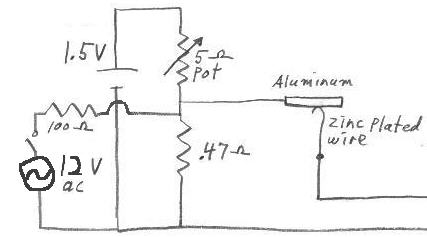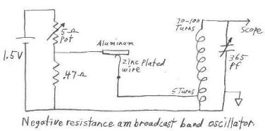 Several different pieces of zinc from different sources, in addition to the galvanized wire, were tried and they all seemed to work for making the negative resistance. I also had success using different pieces of aluminum from different sources. None of the pieces of aluminum were anodized. I was even able to get the circuit to work after buffing the aluminum and galvanized wire with a piece of "Scotchbright" like material. No special treatment or heating needed to be done to either the zinc or aluminum. The aluminum and the galvanized steel wire were used in their original condition.