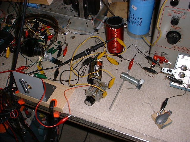 In trying to produce higher frequencies of the order of 7 mhz, I substituted an LC circuit with a smaller inductance coil. While using this higher frequency LC circuit, the long sloppy clip leads used to build the circuit, were a much greater factor in determining the frequency than the LC circuit was. By taking the LC circuit out and substituting it with just varous sized inductors or even just pieces of wire, in series with the negative resistance device, a relaxation oscillator was made. This relaxation oscillator could be made to run anywhere from audio frequencies to (with careful coaxing) 12 mhz, depending on the size of the inductance in the circuit. The higher frequencies were produced just by putting various lengths of the wire in series with the device.