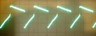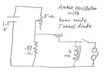 The low (approx 250 millivolt) bias voltage for this device was produced across a .47 ohm resistor, connected to the battery through a 5 ohm pot. This means drawing 500 to 600 milliamps from a 1 1/2 volt battery in order to supply approx 35 ma to the device. A 5 ohm pot is not as common as a 50 k ohm pot but can be easily obtained at a surplus outlet. It might also be easy to improvise a 5 ohm pot from something like a pencil lead. It was easy to run the circuit from a single AA cell but of course a D cell is much more suitable when drawing this much current. An emitter follower circuit could be a much more efficient way to bias this device but I like to have this circuit completely void of any commercially made transistors or other active devices. I wanted to be absolutely sure, that this homemade device is indeed what is actually producing the oscillations. Below are schematics and waveform pictures of an LC oscillator and a relaxation oscillator.