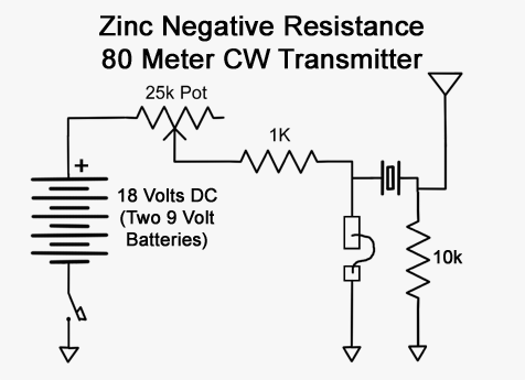 Many of the rewards from writing web page articles come in the form of emails and gems of information from readers. I recently received an email from Robert Nickels W9RAN who had read my first article about the zinc oscillator. He reported success in making a zinc negative resistance crystal oscillator run at 3.579 mhz (middle of 80 meter ham band). I had not tried using crystals with the zinc oscillator in the past and was excited to hear of his success at 3.58 mhz.