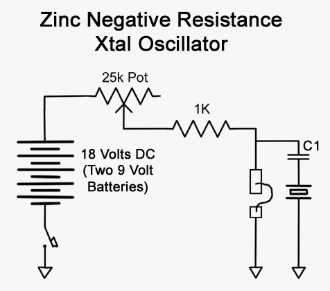 The diagram above shows the zinc negative resistance crystal oscillator. C1 is usually not necessary for 80 meter crystals (3.5 - 4 mhz) but C1 makes it much easier with higher frequency crystals such as 7 mh to 10 mhz.